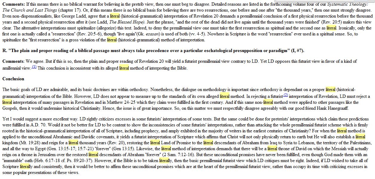 For example, when he was writing against Hank Hanegraaf’s book, The Last Disciple, Geisler wrote: “the literal (historical-grammatical) method of interpretation is the correct one. We do not agree, however, as to who is more consistent in their use of this method. Dispensationalists see an inconsistency in the anti-futurist method since many predictions in Matthew 24-25 and Revelation 6-18 were not fulfilled in A.D. 70 – at least not literally” (underlined emphasis mine).