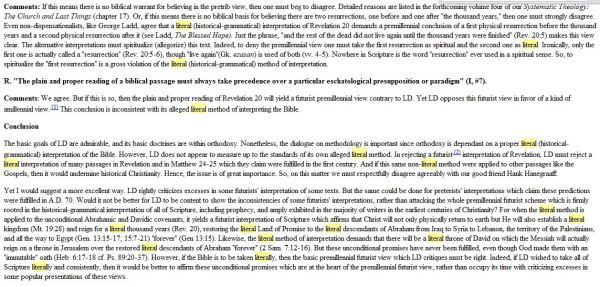 One of the more ironic evidences of this problem comes from the fact that two of the most influential hermeneutics books affirming the GHM were written by Milton Terry and Bernard Ramm. These books have been cited as exemplars of the GHM (e.g., Terry’s book was used as a textbook at Dallas Theological Seminary, and Robert Thomas cites both books approvingly in Evangelical Hermeneutics – see esp. chapters 3 and 6 notes). The reason for the irony is that Milton Terry is a preterist and Bernard Ramm is amillennial – two positions schools like DTS and scholars like Thomas and Geisler attack for not following the GHM! (For details see my article The Hermeneutics of Eschatology: Preterism and Dispensationalism Compared).