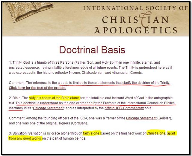 Not only are these beliefs clearly post-Reformation in origin, it actually reflects 21st Century thought – for whatever the doctrinal statement actually says, it must be understood as the ISCA framers meant it. Ironically, the protestant ISCA Framers require a doctrinal “magisterium” in case anyone dissents from the statement as they mean it (which reflects the argumentative strategy Geisler often uses in his attack on the beliefs of others, e.g., members of ETS and scholars like Michael Licona). Yet the need for a “magisterium” is used by Geisler to attack Catholicism! (A lesser but also interesting irony is that the 2014 ISCA president Don Williams is an internationally recognized expert on the likes of G. K. Chesterton, C. S. Lewis, and J. R. R. Tolkien – none of whom ISCA would accept as members!)