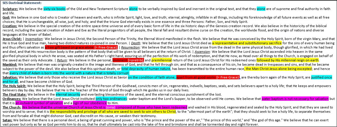 The SES doctrinal statement, for example, contains numerous doctrines that only came into popularity during (blue) or after (purple) the Reformation; others are as late as the 19th or 20th centuries (red), and some are merely choices from among several historic options (yellow):