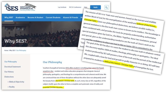 Note that in all three cases above, the institutes assert that they are defending “the historic Christian faith.” The third qualifies the phrase as being equivalent to the institution’s own beliefs, as does that of Ratio Christi (an organization started at SES after Geisler left, but which was started by his students):