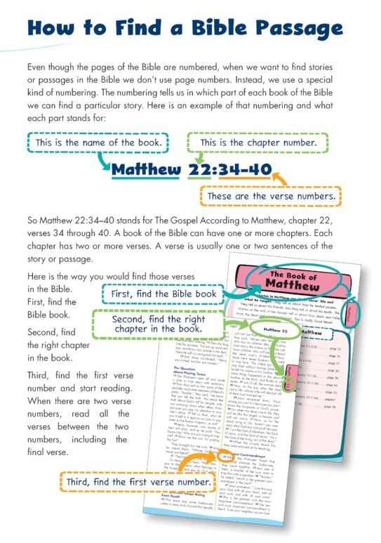 After explaining where the books are, it then shows readers how to find Bible verses. Again note the colored tabs which match the side page coloration (pictured above) so the different books can be found more quickly.