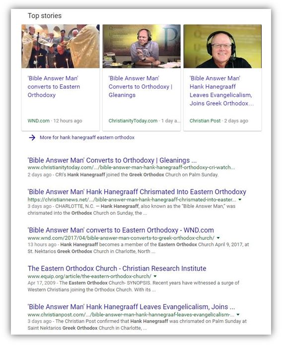 As I mentioned earlier, on April 9th, 2017, Hank Hanegraaff, long time host of the Bible Answer Man radio program and president of the Christian Research Institute, became a member of the Eastern Orthodox Church.