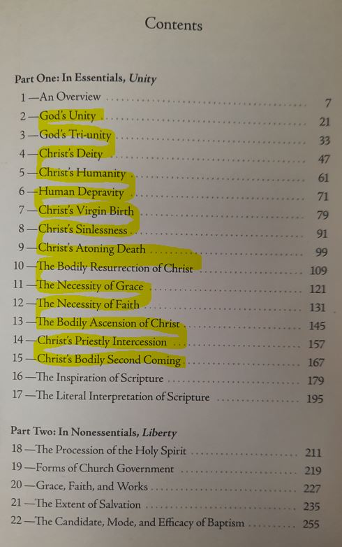 (1) human depravity, (2) Christ’s virgin birth, (3) Christ’s sinlessness, (4) Christ’s deity, (5) Christ’s humanity, (6) God’s unity, (7) God’s triunity, (8) the necessity of God’s grace, (9) the necessity of faith, (10) Christ’s atoning death, (11) Christ’s bodily resurrection, (12) Christ’s bodily ascension, (13) Christ’s present high priestly service, and (14) Christ’s second coming, final judgment (heaven and hell), and reign. [CRJ]