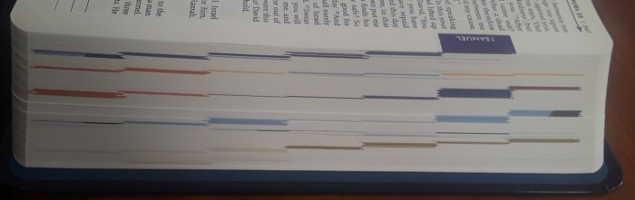 The cover is nice and the Bible has a good feel overall – sturdy but not fancy (so far they are all blue). My first thought was that it was smaller than I expected. Study Bibles are sometimes rather large, to accommodate all the extra-biblical features. For reasons I quickly discovered, the GACB is about the same size as most non-study Bibles.