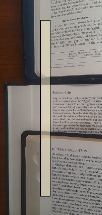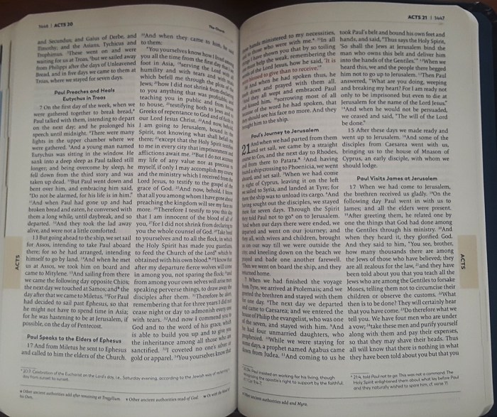 I must admit that my initial flip-through was rather disappointing. It was difficult to tell there was anything special about this Bible. Indeed, with almost no notes or cross-references on most pages, it looked like a rather typical Bible. The font size was good, though, and the clean two-column layout makes it very readable. In the New Testament, Jesus’ words are highlighted by red lettering.