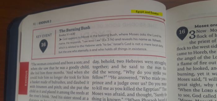 Another questionable advertising claim for the GACB is its “tab” system which is simply printed in the page margins. The color-coding follows the Bible Timeline system, and those familiar with it will appreciate the at-a-glance element this adds to the Bible’s side view. However, these labels do not stick out, nor are they carved into the pages – so I am not sure how this counts as a “thumb index” (perhaps Ascension did not want to create competition for its Great Adventure Catholic Bible Indexing Tabs).