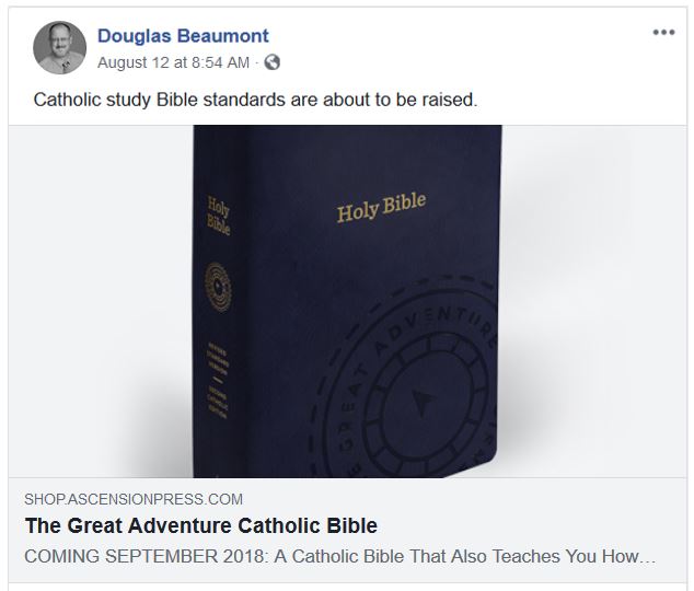 I’m a big fan of Jeff Cavins’s fantastic Bible Timeline materials, so I was very excited to learn of Ascension Press’s release of the Great Adventure Catholic Bible which incorporated them into a single volume. I posted the ad all over social media, and was one of the first to order one.