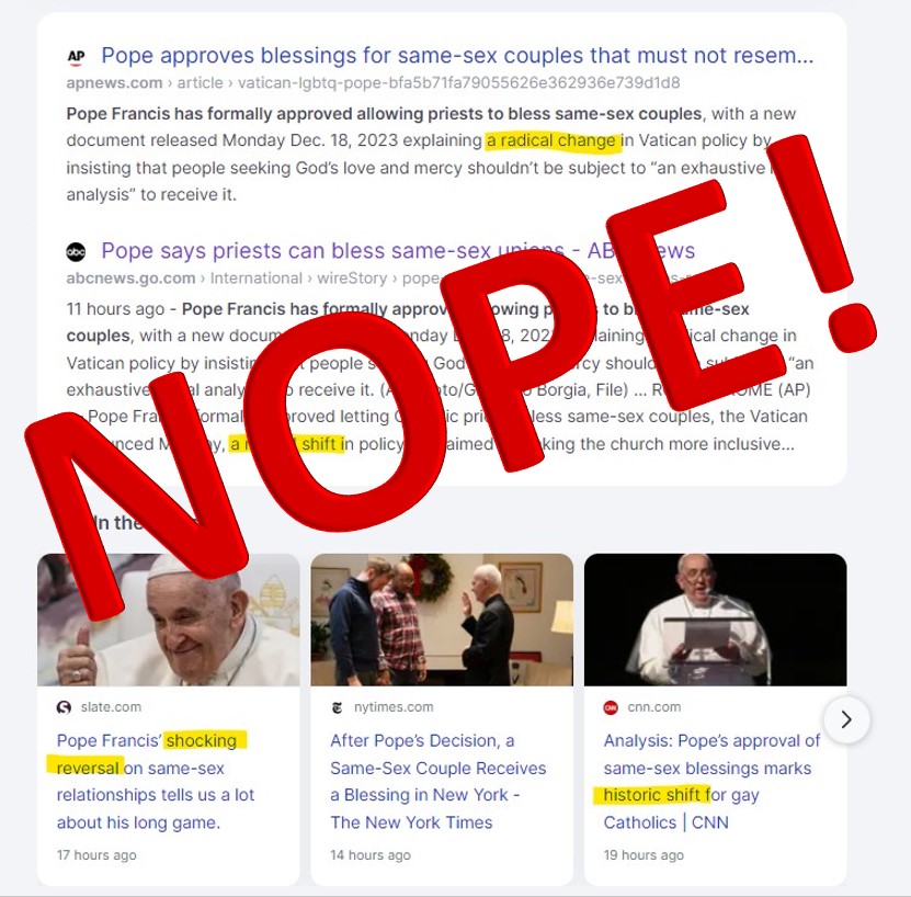 The document’s “innovative contribution” is not a theological innovation in the way the media portray it (e.g., “radical change,” “shocking reversal,” “historic shift”). And even if it was, the innovation / development isn’t even directed toward same-sex unions – rather it concerns “the pastoral meaning of blessings” (emphasis in original). Could Fiducia Supplicans have been clearer and included more pastoral instruction on proper catechesis and direction for those in same-sex relationships? Yes. Did it radically reverse Church teaching? Not at all.